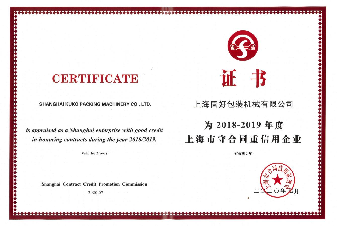In July 2020, Shanghai KUKO Packaing Machinery Co., Ltd. was awarded the honorary certificate of 2018-2019 Shanghai Contract-honoring and Credit-Reliable Enterprise and Shanghai Harmonious Labor Relations Enterprise.